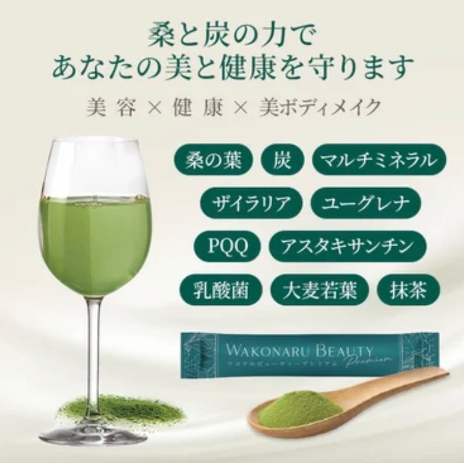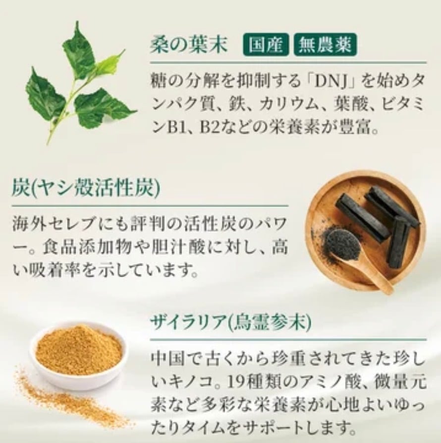 桑の葉末(国内製造)、水溶性食物繊維、抹茶、でん粉、白インゲン豆エキス末、ヤシ活性炭、植物性乳酸菌(殺菌)末(植物性乳酸菌、テキストリン)、豚プラセンタエキス末(豚プラセンタエキス末、サイクロデキストリン)、大豆抽出物(大豆を含む)、パン酵母(亜鉛、マンガン、銅、ヨウ素、セレン、クロム、モリブデン含有)、ピロロキノリンキノンニナトリウム塩、環状オリゴ糖、ヘマトコッカス藻色素