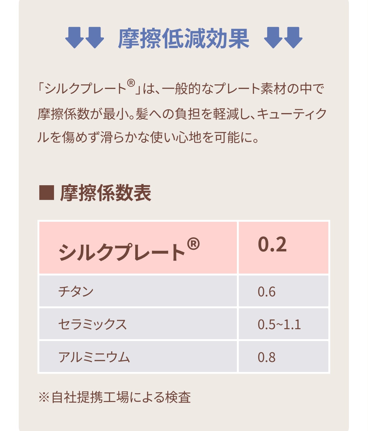 【シルクプレート®︎】は、一般的なプレート素材の中で摩擦係数が最小なので、髪がプレートに引っかからにくいため、髪への負担を軽減し、キューティクルを傷めず滑らかな使い心地を可能にしました。