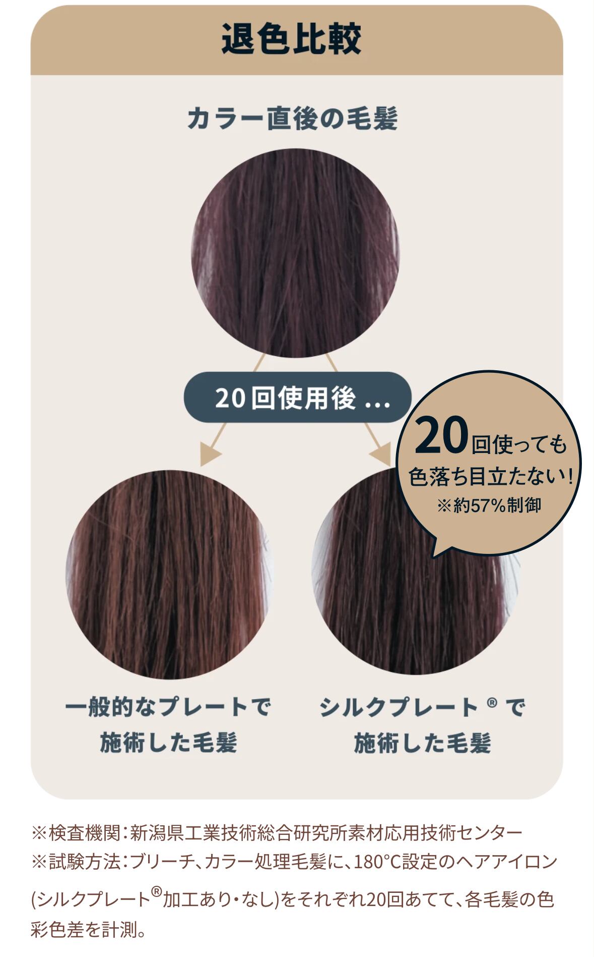 シルクプレート®︎は熱ダメージによる色素破壊やカラー剤の流出を軽減。ヘアカラーの色落ちや退色を抑制し、美しい髪色を長時間キープ。